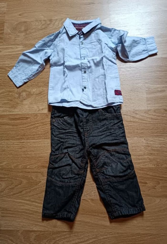 Jean bleu foncé, doublure chaude écossaise Chemise bleu manches longues Orchestra 9 mois