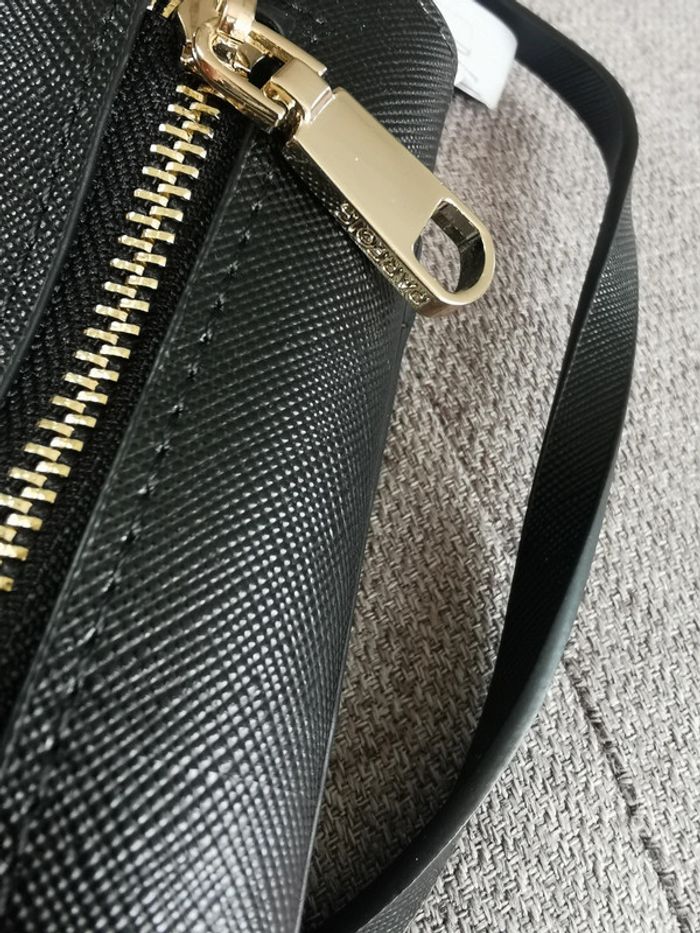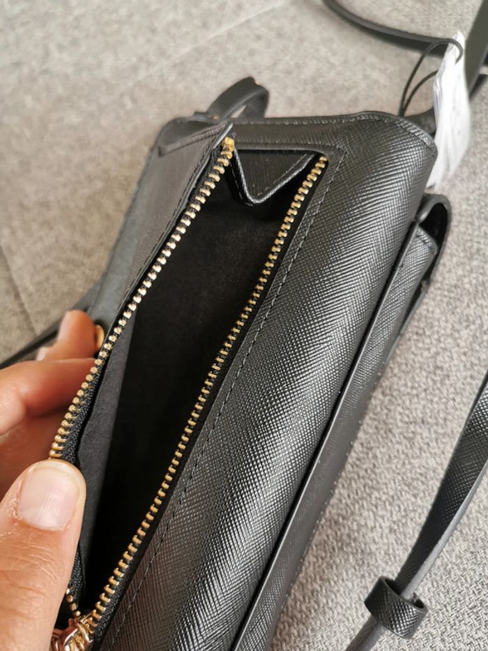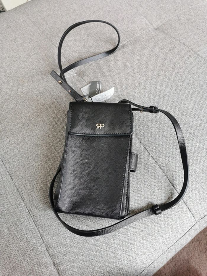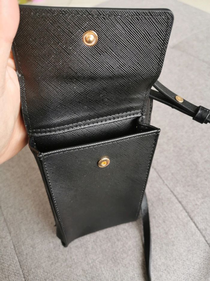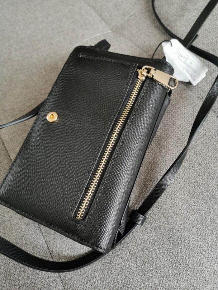Sac bandoulière, pochette pour téléphone. Parfois Pochette pour téléphone avec effet cuir. Compartiment avec rabat aimanté. Section avec fermeture éclair comprenant des fentes pour cartes et billets ; compartiment intérieur avec fermeture éclair pour les pièces de monnaie. Fentes extérieures au dos. Bandoulière.