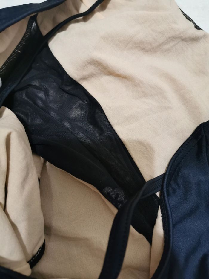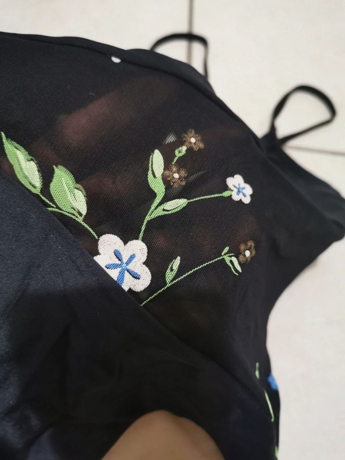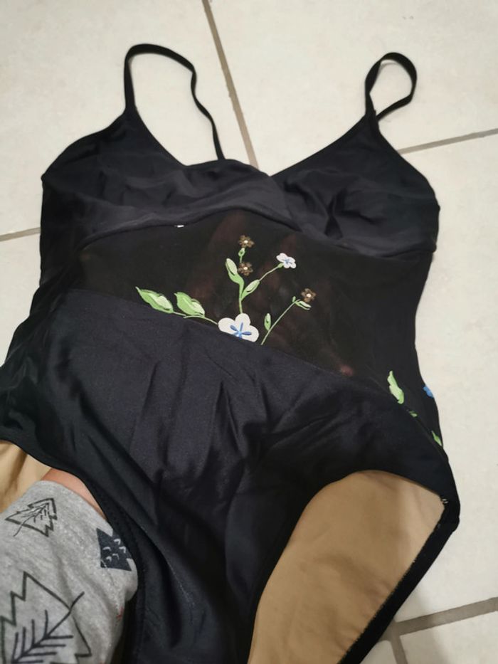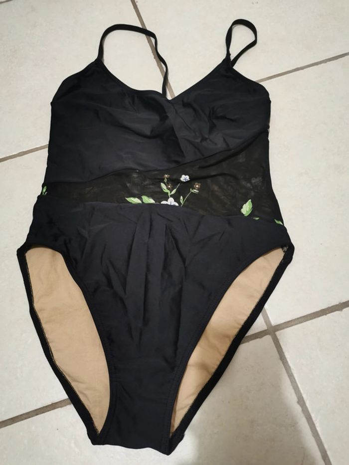 Maillot de bain 1 pièce Noir avec ventre en tulle ajouré et broderies florales Dos et cuisses échancrées type vintage Made in Spain Taille XL /42 tbe
