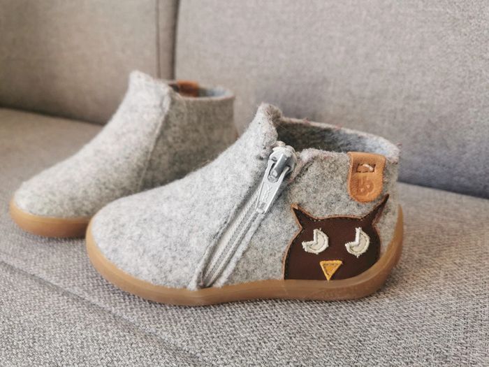 Chaussons en laine grise avec semelle en caoutchouc avec insert Hibou/Chouette Babybotte Taille 23 (grand) Excellent état #mixte