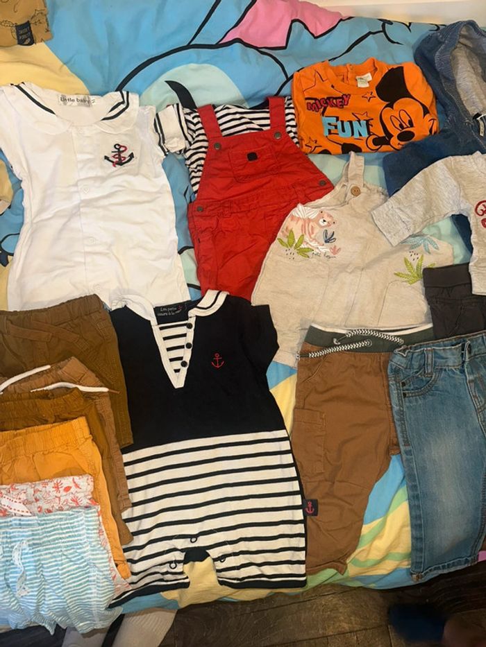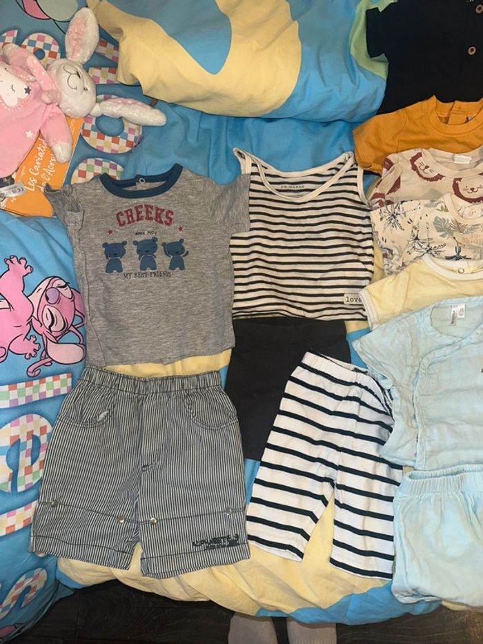 7 short 7 t-shirt 1 bodie assorti au short gaze de coton 2 barboteuses Col marinière 1 salopette avec son t-shirt 1 salopette en lin 1 bonnet en coton 1 t-shirt manches longues 1 ensemble de survêtement jack&jones 1 gilet à capuche 2 leggings ( 1 court ) 1 jean 1 jegging 1 jogging