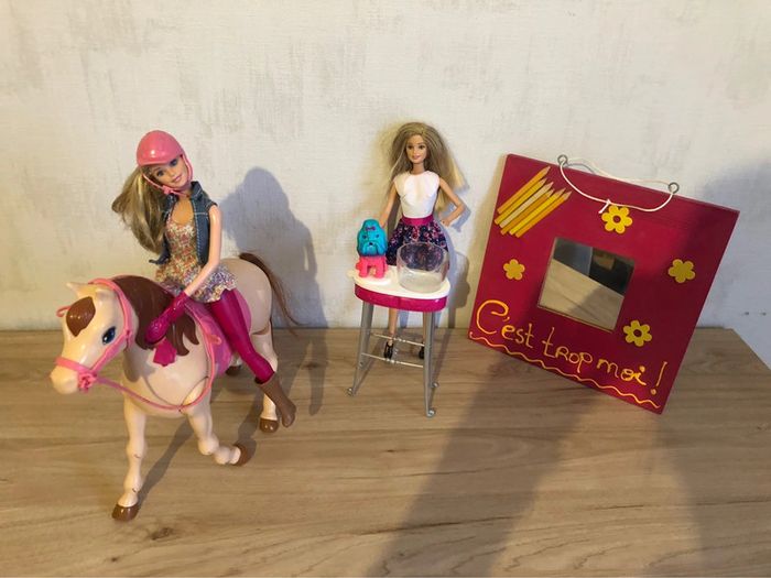 Lot barbies + miroir Barbie aller hop à cheval La Barbie monte sur le cheval à l’aide d’un bouton et avec un autre bouton le cheval marche seul. Barbie toilleteuse Le chien change de couleur selon l’eau chaude ou froide Petit miroir Très bon état