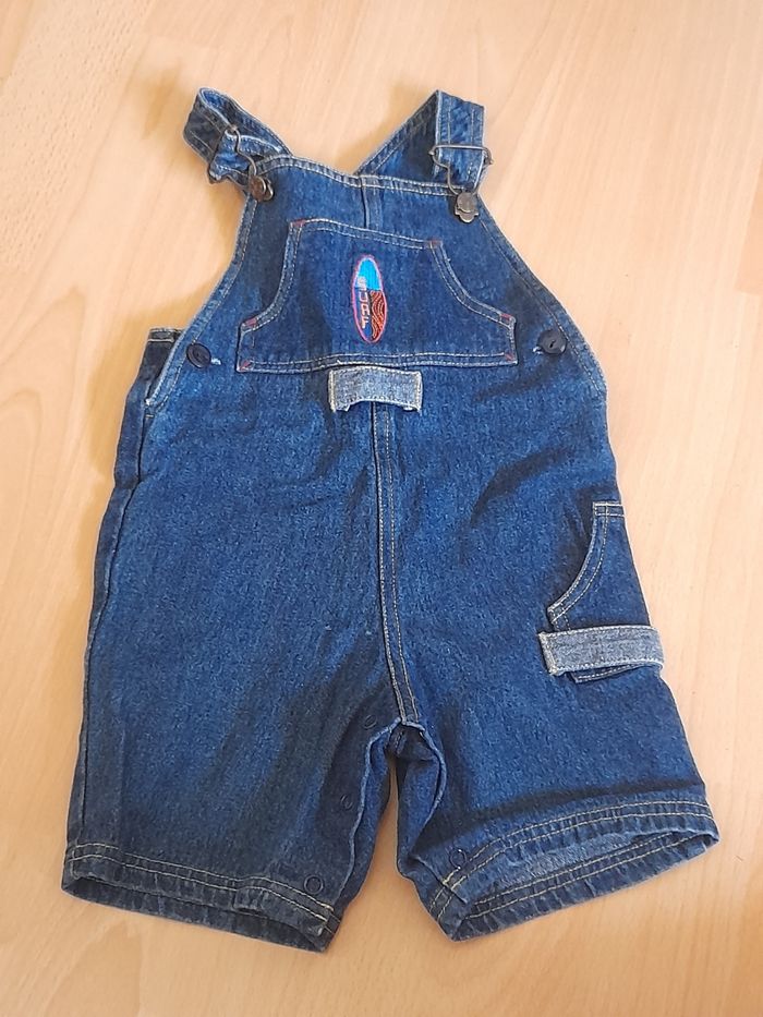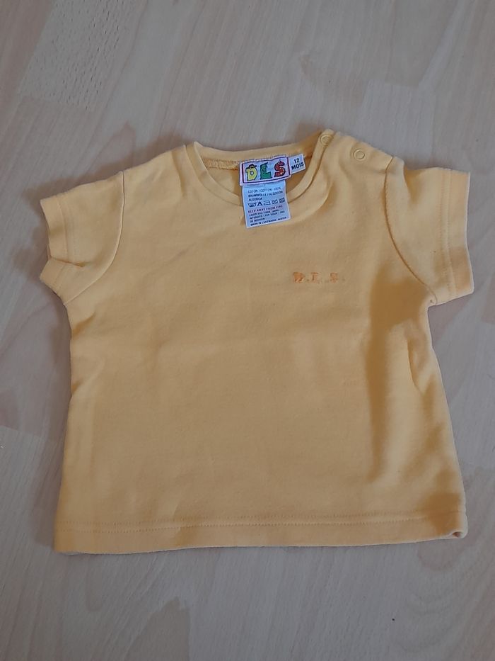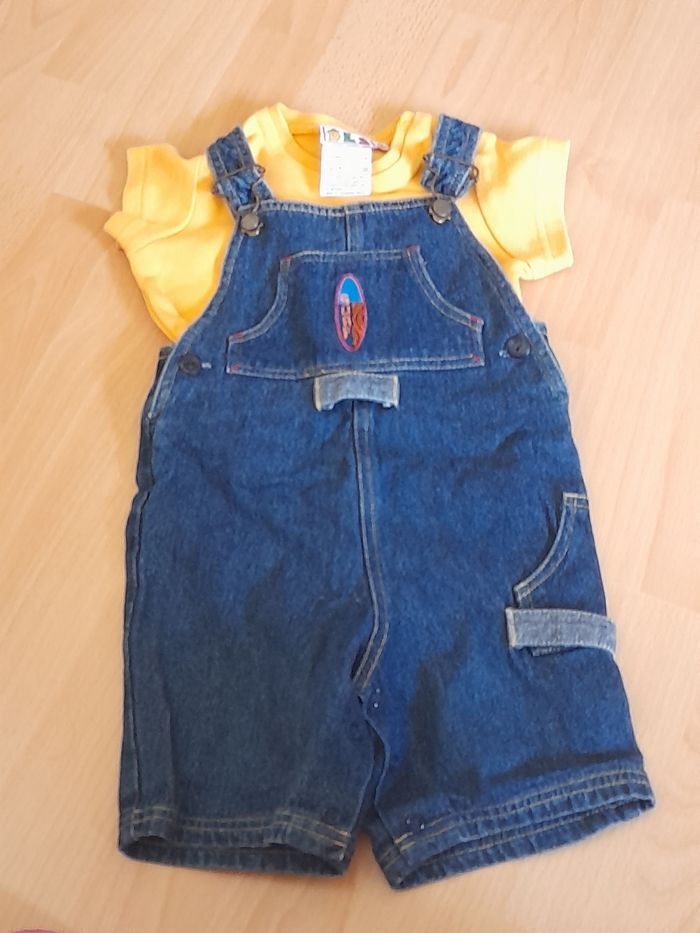 Ensemble salopette short en Jeans et tee shirt jaune état correct Tee shirt 100% coton Salopette 100% coton Marque du lundi au samedi Taille 12 mois