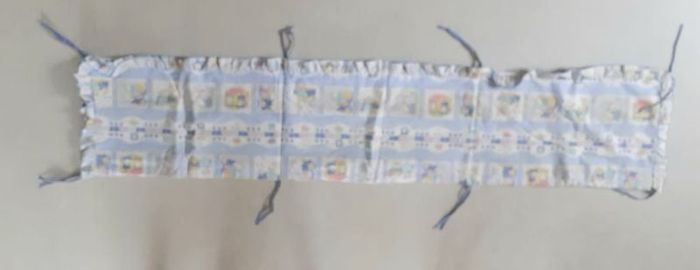 Tour de lit pour lit à barreaux fond bleu ciel, avec décoration "ourson" avec volant sur le haut avec liens pour attacher au lit dimensions : 3 longeurs 60 cm x hauteur 35 cm + 4 cm de hauteur de volant 50% coton / 50% polyester, garnissage ouate Très bon état