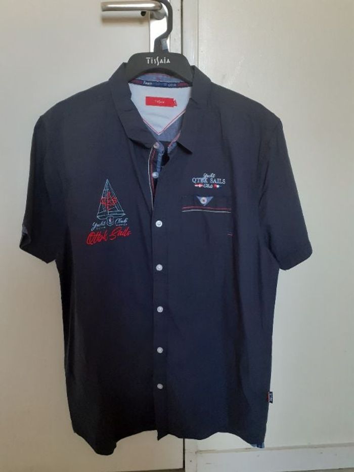 Chemise bleu marine avec imprimés brodés manches courtes taille XL de marque Tissaia Neuve