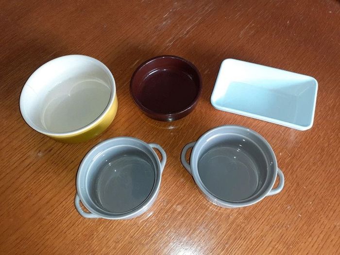 Lot de 5 ramequins 1 rond diamètre 14 cm x hauteur 5 cm, extérieur jaune et intérieur écru 1 rond diamètre 11 cm x hauteur 3 cm, marron 2 ronds diamètre 10,5 cm x hauteur 5 cm, gris, avec poignées 1 rectangulaire 14,5 cm x 9 cm x hauteur 3,5 cm, blanc