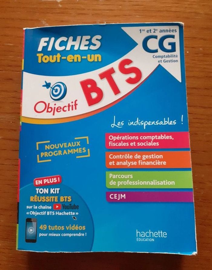 Livre "FiCHES TOUT-EN-UN" Objectif BTS 1ère & 2ème année CG (Compta & Gestion) 161 fiches pour réviser et réussir le BTS CG Edition Hachette Education Rappels de cours pour mémoriser l’essentiel Les définitionsà connaître Schémas et des exemples pour bien comprendre Descriptif des épreuves et des conseils pour réussir