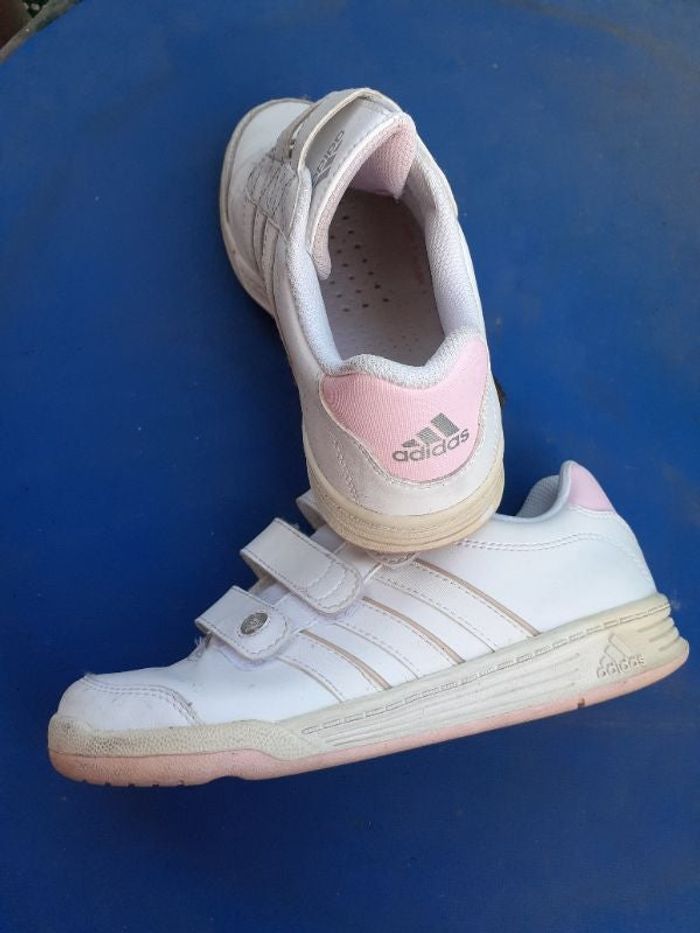 Baskets blanches de marque Adidas, rebord rose au dos fermeture à scratch pointure 34