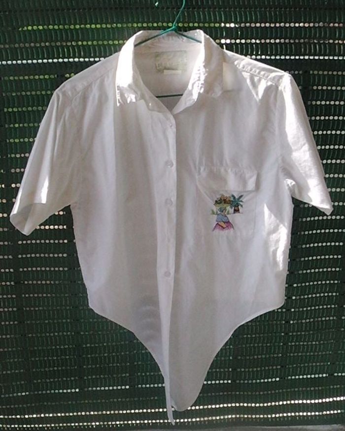 Chemisier blanc, manches courtes, avec imprimé sur poche, bas à nouer. Taille 2 (mais taille petit)