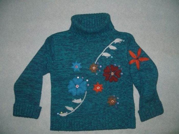 PULL à col roulé, vert avec décor fleurs. Bords et col à mailles côtelées. Très chaud. Taille 6 ans.
