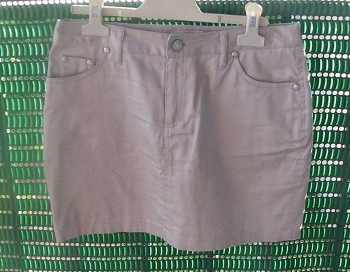 Jupe courte, grise, avec poches devant et dos. Excellent état. Taille 36