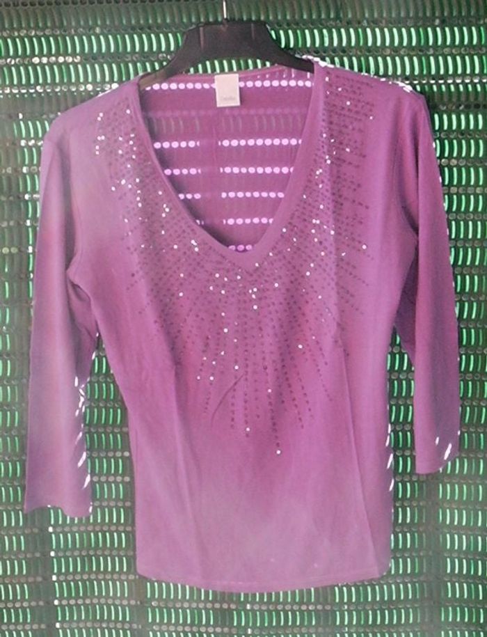 Maillot violet, manches 3/4, col en V avec strass taille 1