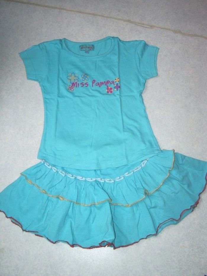 Ensemble bleu roi composé de : 1 jupe à volants x3, avec bords blanc, rose et violet, taille élastique 1 maillot manche courtes, col rond, couleurs assorties à la jupe de marque "Miss Pampa" Excellent état Taille : 5 ans
