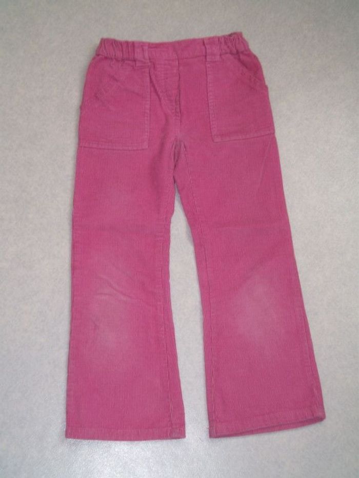Pantalon rose, en velours, avec poches, taille élastique légèrement usé aux genoux. Taille 6 ans