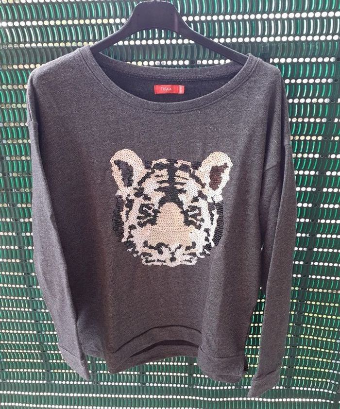 Sweat gris Avec "tête de tigre" en relief, brillant De marque Tissaia Taille 38/40 Excellent état