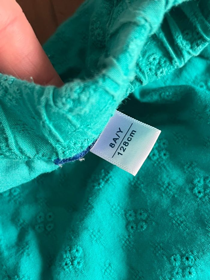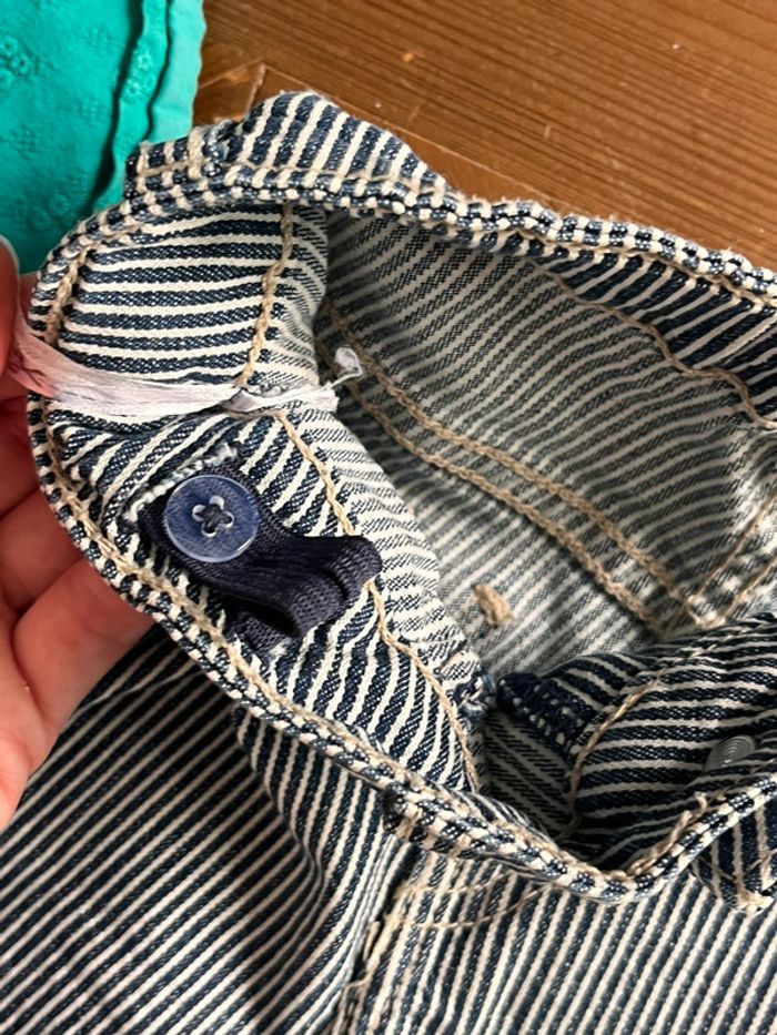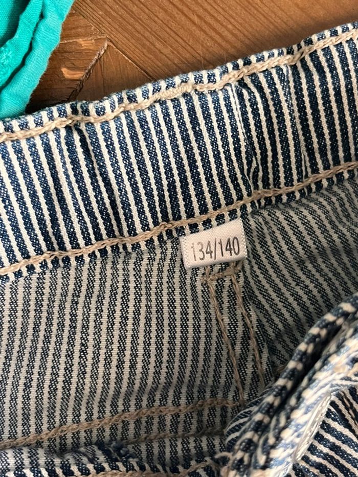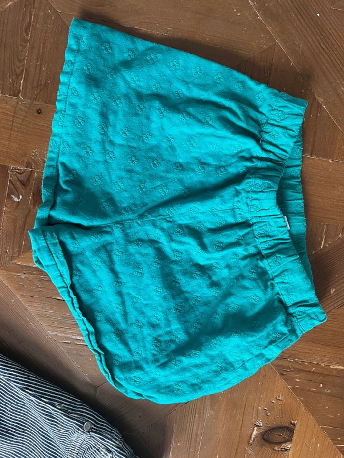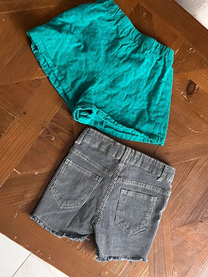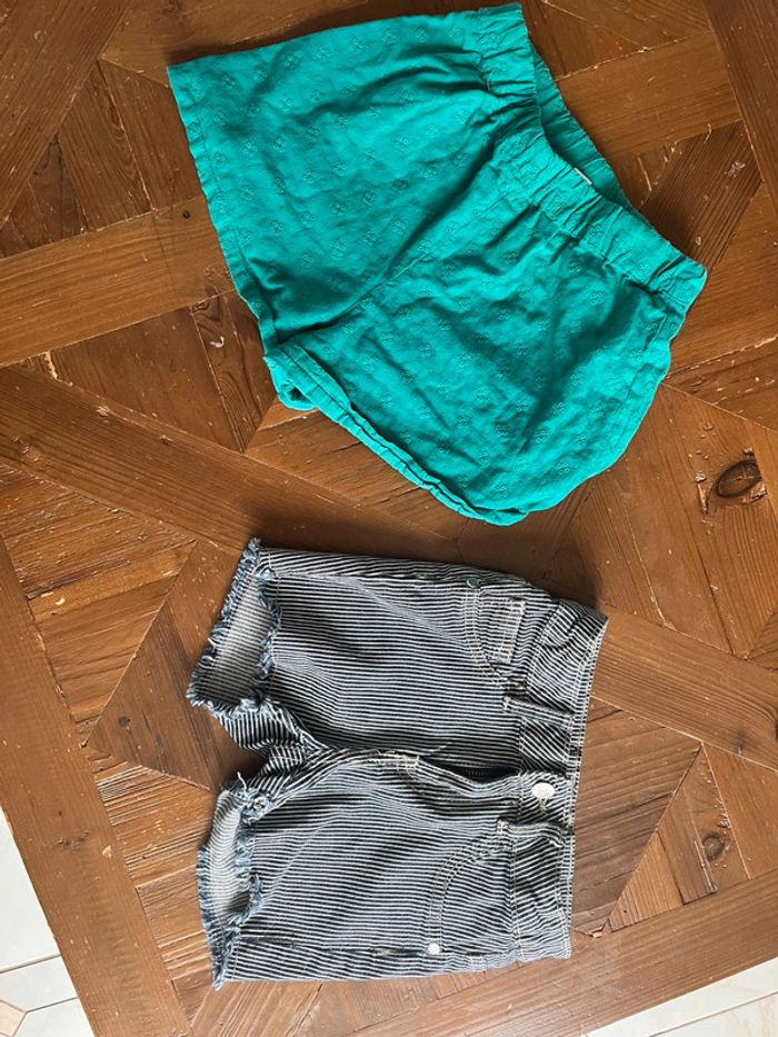2 Shorts fille, taille huit ans, réglables à la taille. Le bleu turquoise de la marque Okaidi, le rayé sans marques identifiées. #jp_01fille8ans #shortfille8ans #shortfille