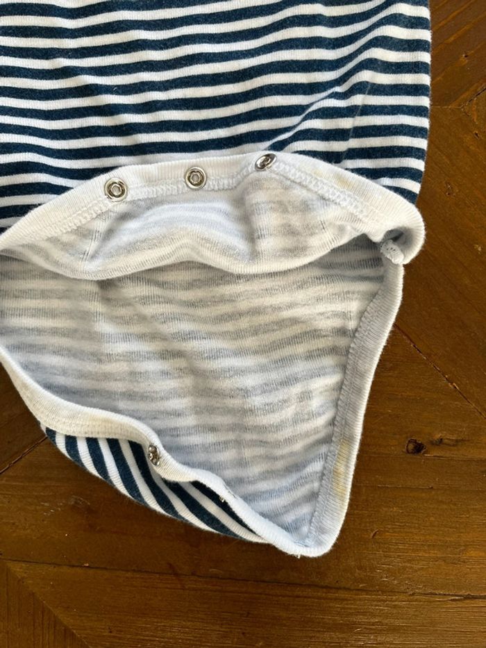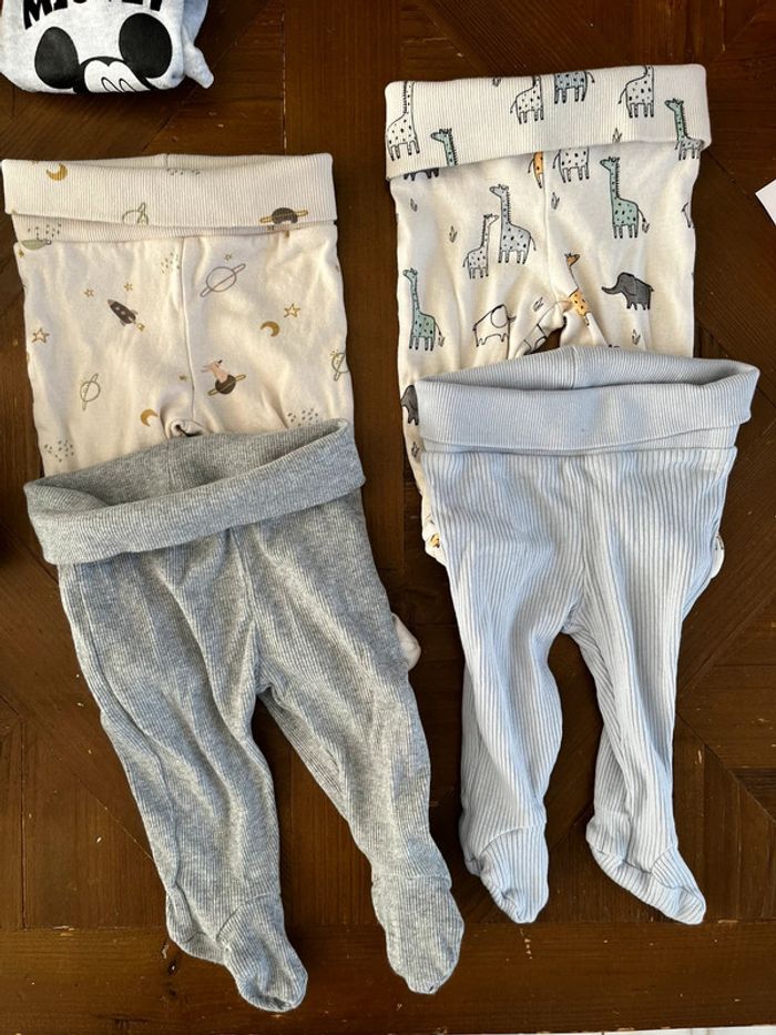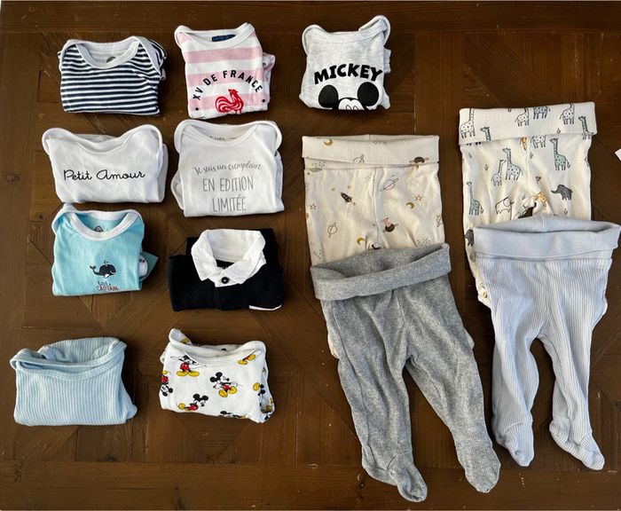 Lot 3 mois avec 9 bodies manches longues et 4 leggings à pieds. Multimarques. Le bleu à col est neuf : lavé mais jamais porté. Le rose porté une fois, le rayé est taché ce photo. #jp_01bebemixte #jp_01garcon3mois