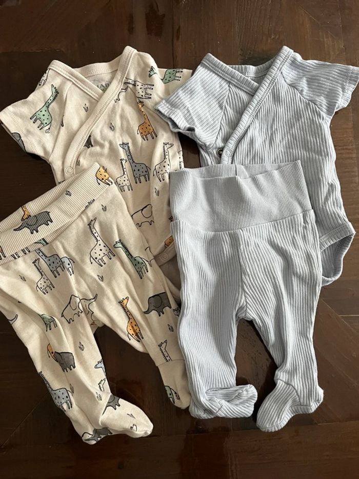 2 ensembles bodie + pantalon taille naissance Porté une fois : grand bébé à la naissance. Le bodie est réglable cf photo #jp_01bebemixte #jp_01fillenaissance #jp_01garconnaissance