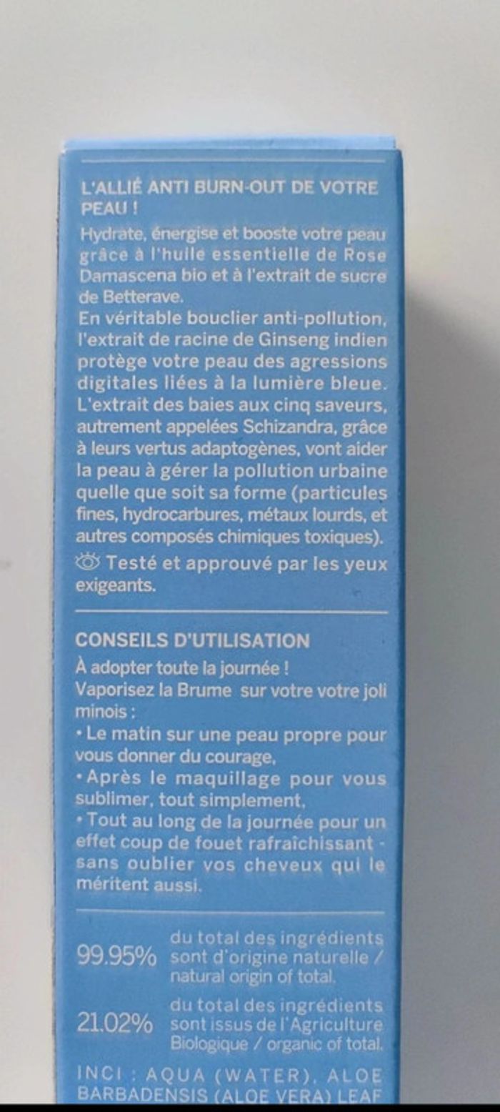 100ml Pour les peaux ternes qui boudent un peu. Hydrate, énergise et booste votre peau grâce à l'huile essentielle de Rose Damascena bio et à l'extrait de sucre de Betterave. En véritable bouclier anti-pollution, l'extrait de racine de Ginseng indien protège votre peau des agressions digitales liées à la lumière bleue. L'extrait des baies aux cinq saveurs, autrement appelées Schizandra, grâce à leurs vertus adaptogènes, vont aider la peau à gérer la pollution urbaine quelle que soit sa forme (particules fines, hydrocarbures, métaux lourds, et autres composés chimiques toxiques). Testé et approuvé par les yeux exigeants. #JLAhygiene Valeur 29€ #overbooké #aiammaia #bio