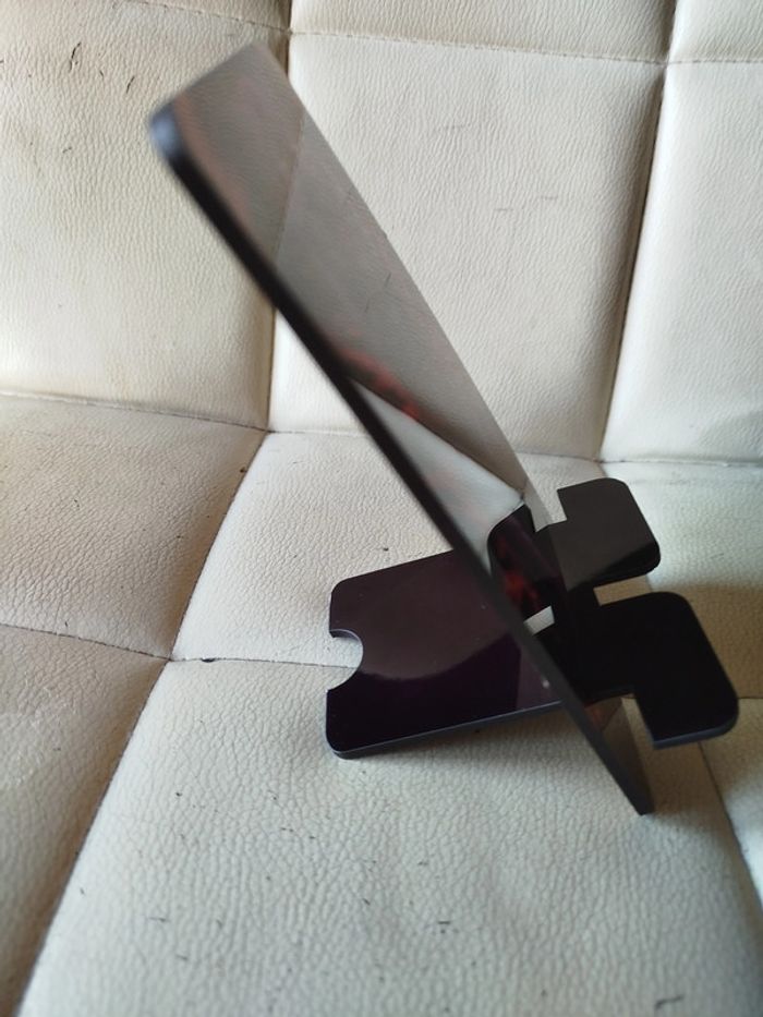 support pour smartphone en MDF. Universel, ce support est composé de deux plaques de MDF brillant. Les deux plaques viennent s'imbriquer pour un support auto-bloquant solide. Deux trous sont prévus pour faire passer un fil de chargement : il peut donc servir de station d’accueil pour smartphone. pour les tous les mobiles et petites tablettes ! • 17 x 9 x 0.3 cm et 9 x 9 x 0.3 cm pour la cale