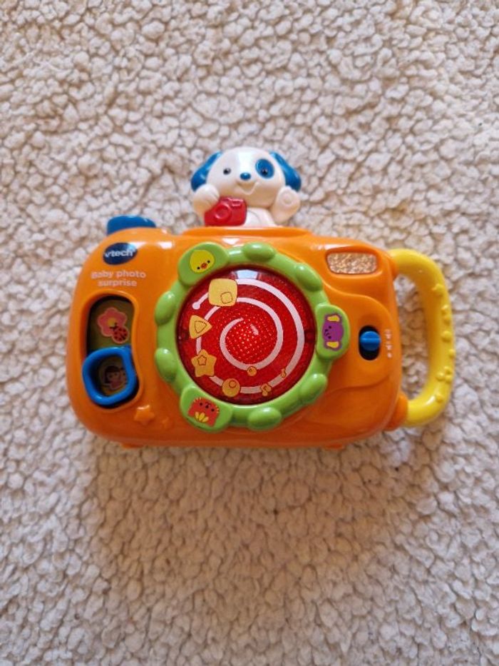 Jouet appareil photo Vtech : Baby photo surprise Imite le son de l'appareil photo, musique et chansons Le chien dessus sort lorsqu'on appuie sur le bouton 2 niveaux sonores Fonctionne avec 2 piles Bon état : traces d'usures avec peinture écaillée du fait de son utilisation Au niveau des piles : très bon état, pas d'oxydation