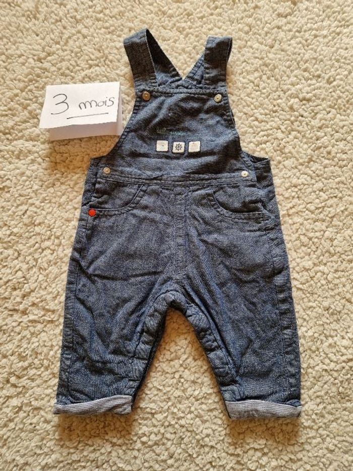 Salopette en jean obaïbi 3 mois Motif marin Ouverture entrejambe 2 niveaux d'attache des bretelles Doublée Très bon état