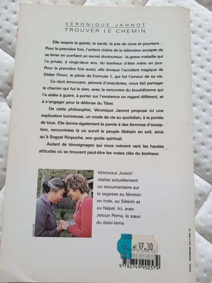 Trouver le chemin Elle respire la gaieté, la santé, la joie de vivre et pourtant... Pour la première fois, l'enfant chérie de la télévision accepte de se livrer en confiant un secret douloureux : la grave maladie qui l'a privée, à vingt-deux ans, du bonheur d'être mère un jour. Pour la première fois aussi, elle évoque l'accident tragique de Didier Pironi, le pilote de Formule 1, qui fut l'amour de sa vie. Ce récit émouvant, jalonné d'anecdotes, nous fait partager le chemin qui fut le sien, avec la rencontre du bouddhisme qui l'a aidée à guérir, à porter sur l'existence un regard différent, et à s'engager pour la défense du Tibet. De cette philosophie, Véronique Jannot propose ici une explication lumineuse, un mode de vie au quotidien, à la portée de tous. Elle donne également la parole à des femmes d'exception, rencontrées là où survit le peuple tibétain en exil, ainsi qu'à Sogyal Rinpoché, son guide spirituel. Autant de témoignages qui nous mènent vers les hautes altitudes où se trouvent peut-être les vraies clés du bonheur.