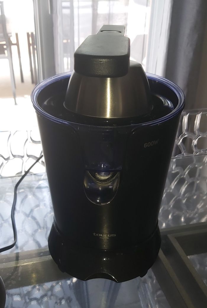 • Presse-agrumes en acier inoxydable avec moteur professionnel : Moteur AC professionnel 600 W ; puissance élevée pour obtenir rapidement un maximum de jus; presse-agrumes de qualité avec filtre; bouche et corps en acier inoxydable • Jus sans effort : presse-fruits avec levier de pression pour obtenir une plus grande quantité de jus sans effort et de la manière la plus confortable ; sans vous salir les mains; démarrage automatique en appuyant simplement sur le cône avec le fruit ; levier en aluminium avec poignée en caoutchouc; Il a des ventouses sur la base pour plus de stabilité et de confort • 2 filtres et 2 cônes : comprend une passoire en acier inoxydable et une passoire avec régulateur de pulpe réglable ; il dispose de 2 cônes de tailles différentes adaptés à tous les types d'agrumes ; presser les oranges; citrons; pamplemousses • 2 systèmes de décharge : sa bouche de sortie a deux positions différentes ; un qui permet de stocker le jus dans le réservoir de 0,65 litre et un autre qui offre un versement direct continu dans le verre ; bouche conçue avec système anti-goutte; versement facile et propre • Entièrement amovible : presse-agrumes entièrement amovible pour un nettoyage facile ; ses pièces passent au lave-vaisselle ; toutes les pièces sans BPA Fonctionne parfaitement Il a 2ans et a servi régulièrement Les tâches blanches sont des dépôts de cire des agrumes Valeur neuf 70€