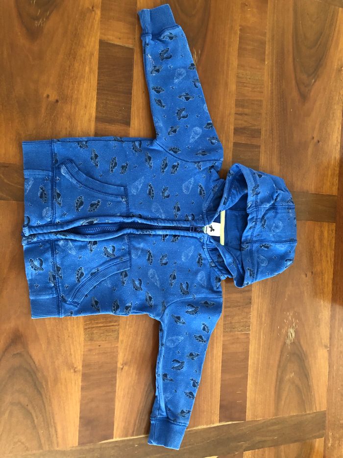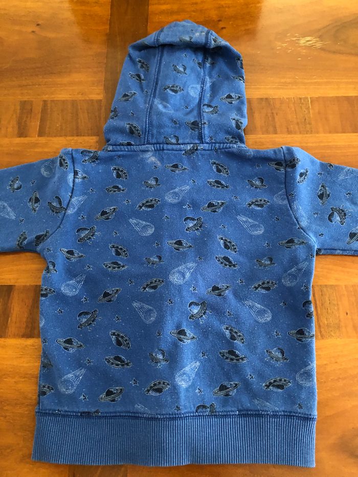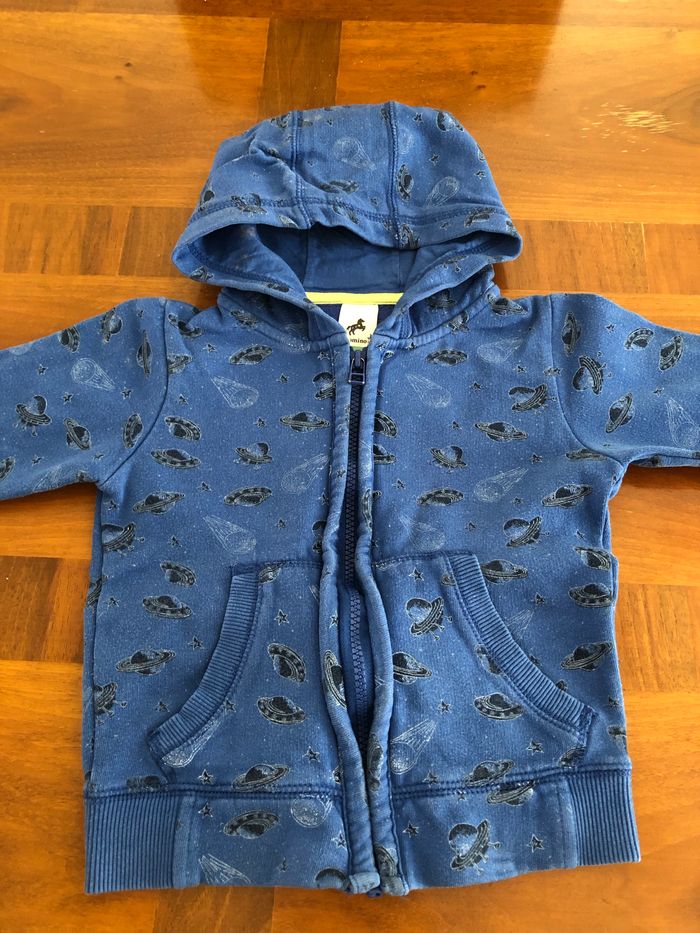 Veste garçon avec capuche Couleur bleu foncée Motifs noirs soucoupe volante et étoiles Fermeture en zip