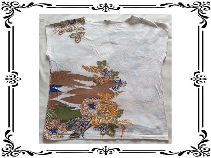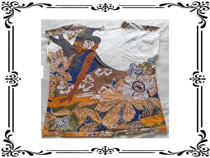 Tee shirt taille 44. Tee shirt blanc, marron et orange avec motifs femme et fleurs. Tissu extensible sur 7 cm. Largeur sous les bras : 53 cm Largeur à la taille : 51 cm Largeur en bas: 53,5 cm Longueur totale: 59 cm Longueur des manches à partir de l’encolure: 18,5 cm En très bon état. Lecomte. 3€. #vero38110vetementsfemme44