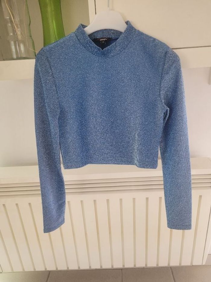 Vends petit haut court bleu et argenté. Marque Jennyfer. Taille XS. Très bon état.