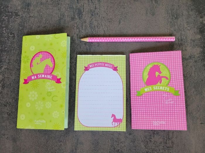 Vends coffret métallique motif cheval comprenant : - 1 crayon à papier neuf - 1 carnet " Ma semaine " - 1 carnet " Mes petites notes " - 1 carnet " Mes secrets " A