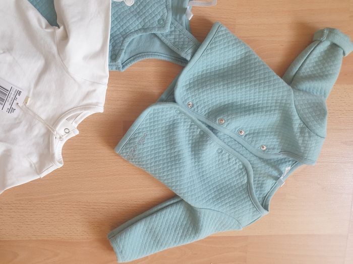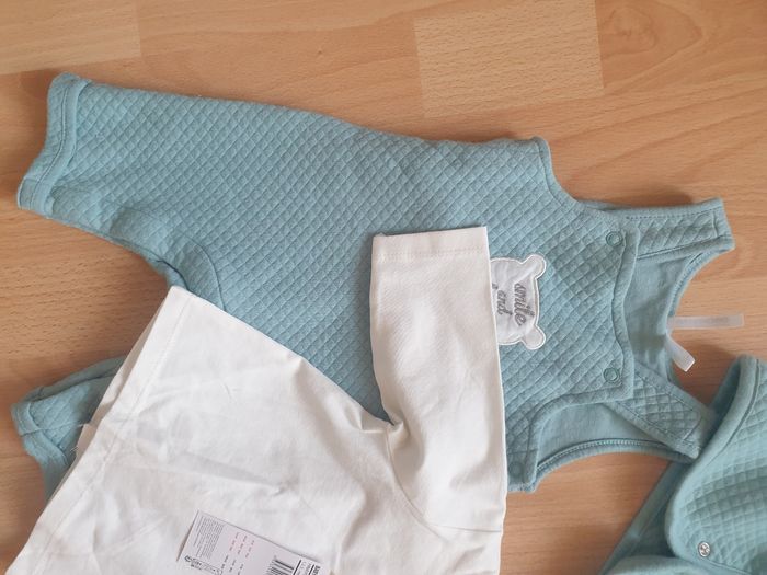 Très bel ensemble avec salopette gilet et tee shirt en 3 mois. Le lot est neuf les 2 pièces bleu on justes ete lavés.