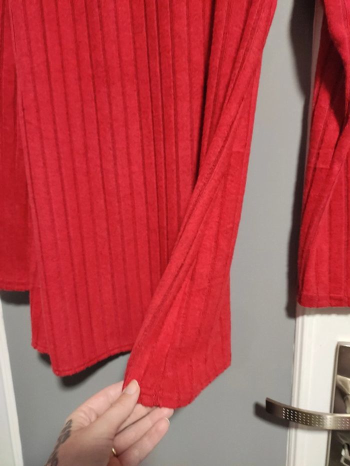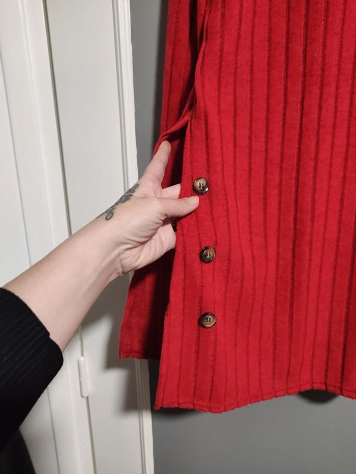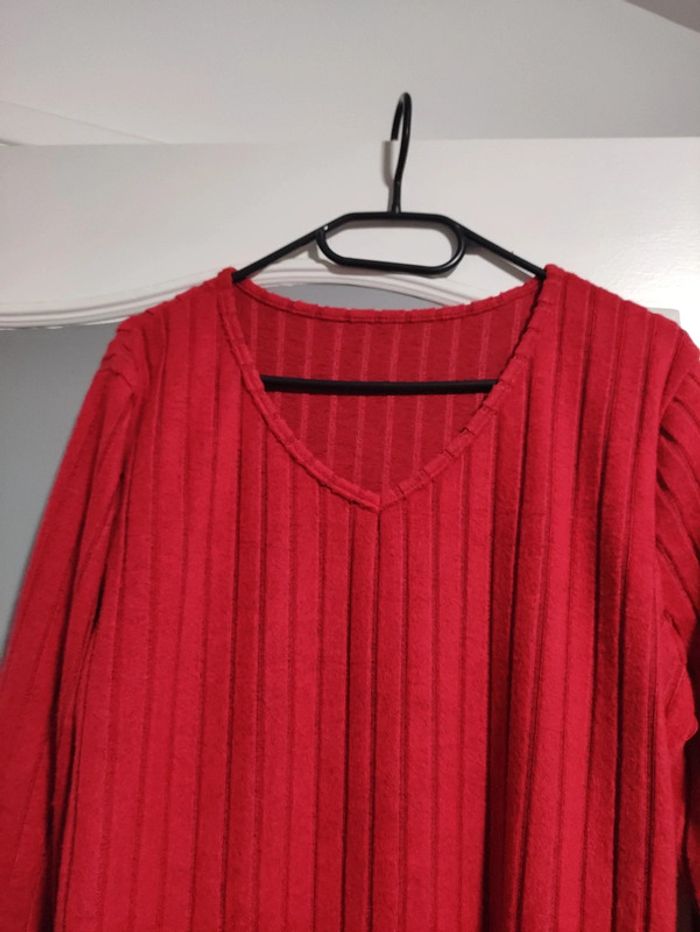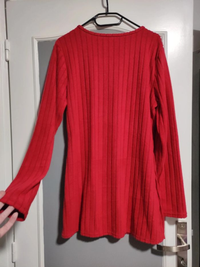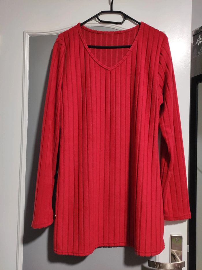 Haut de matière souple. De couleur rouge, col en V. Fente en bas, sur un côté avec plusieurs boutons décoratif. De taille 46. Conviendrait à un 44 aussi. Vêtement sans défaut, qui sort de mon armoire juste avant la photo. En vente car soit c'est plus ma taille, soit je ne l'utilise pas. En vente tel que sur mes photos. Envoi rapide et soigné. Pas de vinted go!
