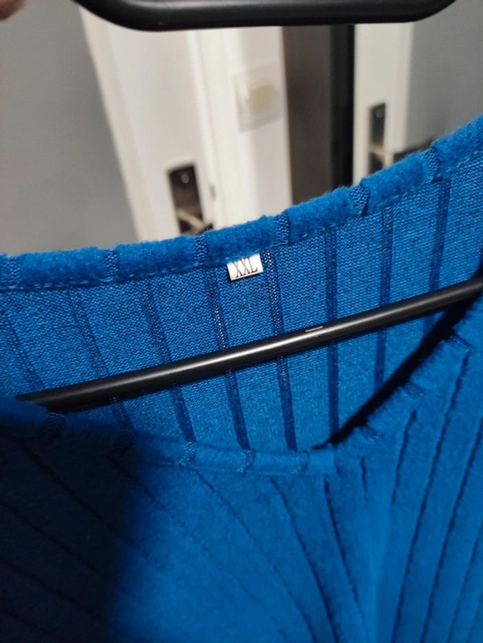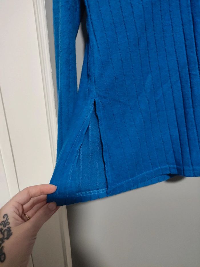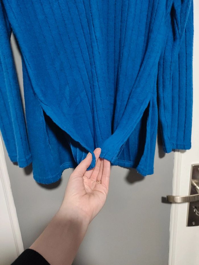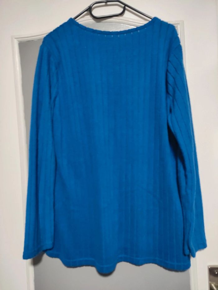 Haut de matière souple. De couleur bleu, col en V. Fente en bas, des deux côtés. De taille 46. Conviendrait à un 44 aussi. Vêtement sans défaut, qui sort de mon armoire juste avant la photo. En vente car soit c'est plus ma taille, soit je ne l'utilise pas. En vente tel que sur mes photos. Envoi rapide et soigné. Pas de vinted go!