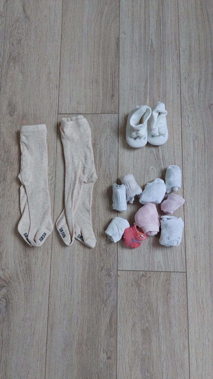 2 gigoteuses 0-6mois 2 pantalons 1 sweat 2 gilets 2 paires de collants 7 paires de chaussettes 1 robe avec bloomer et bandeau assorti 1 paire de chaussons 3 mois