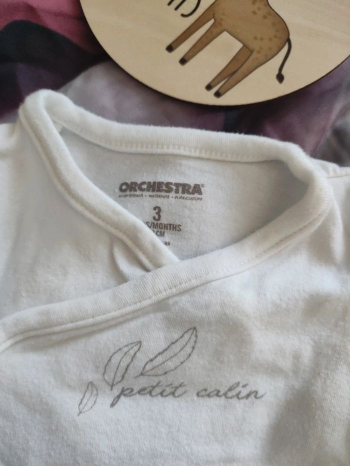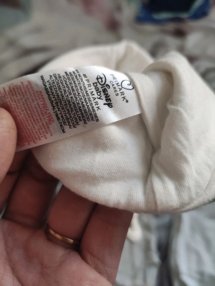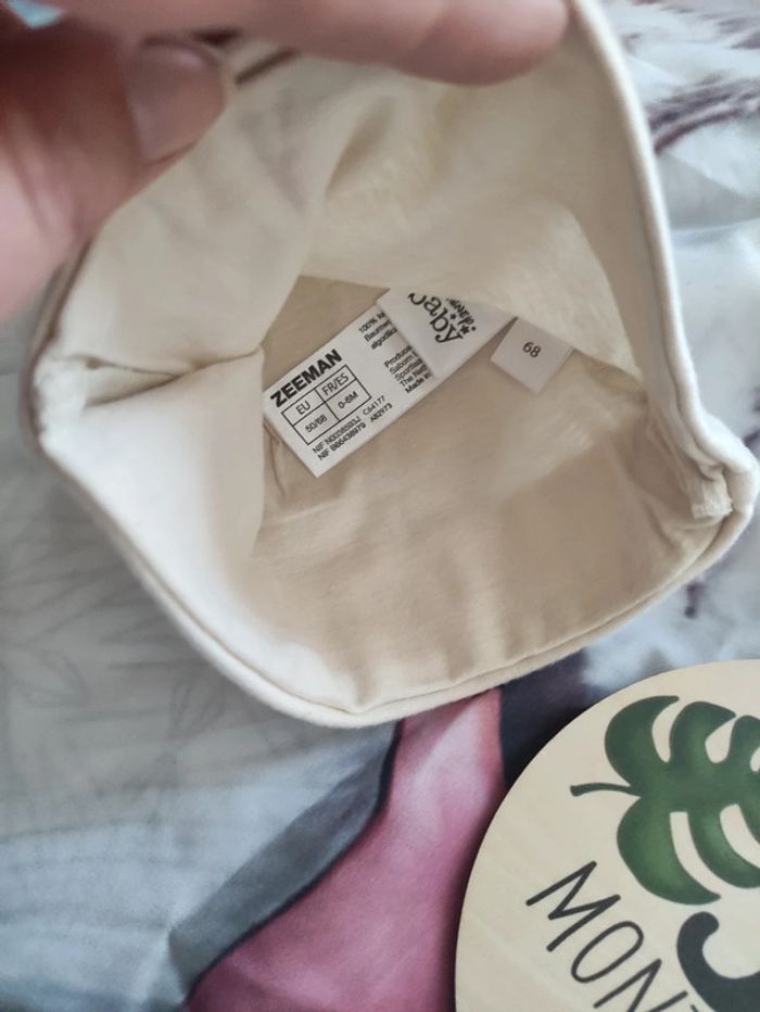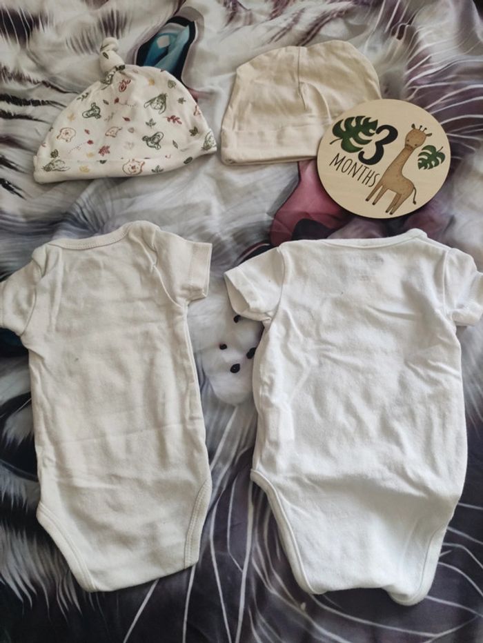 Lot mixte de 2 body d'été, manches courtes, un de marque Orchestra et l'autre étiquette coupée. Plus 2 bonnets Winnie l'ourson. De chez Primark et l'autre Zeeman. Taille 3 mois.