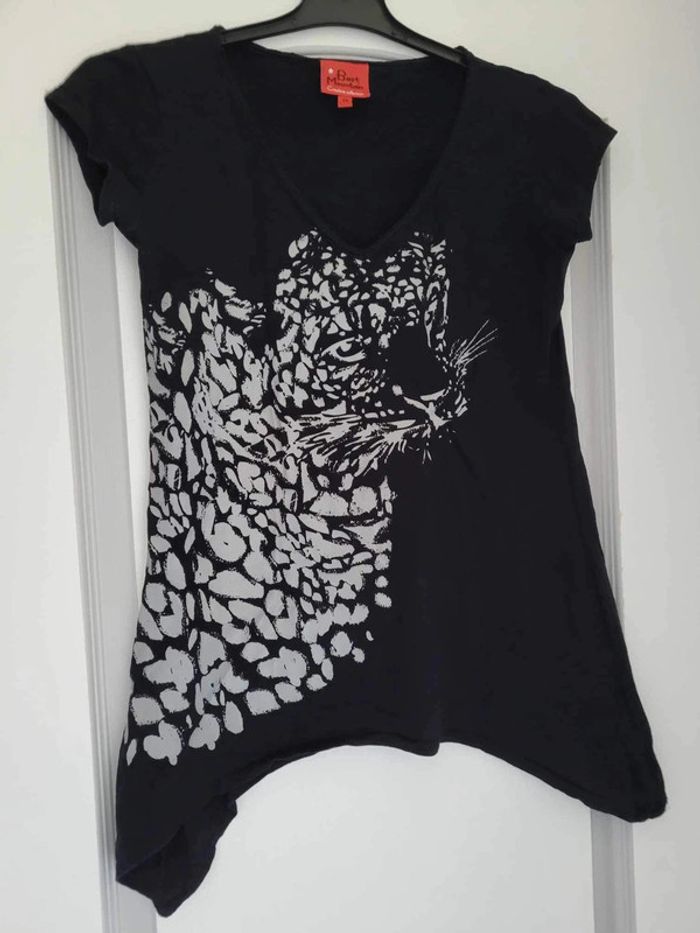 Tee-shirt femme plus long sur les côtés noir motif jaguar Best Mountain taille 38