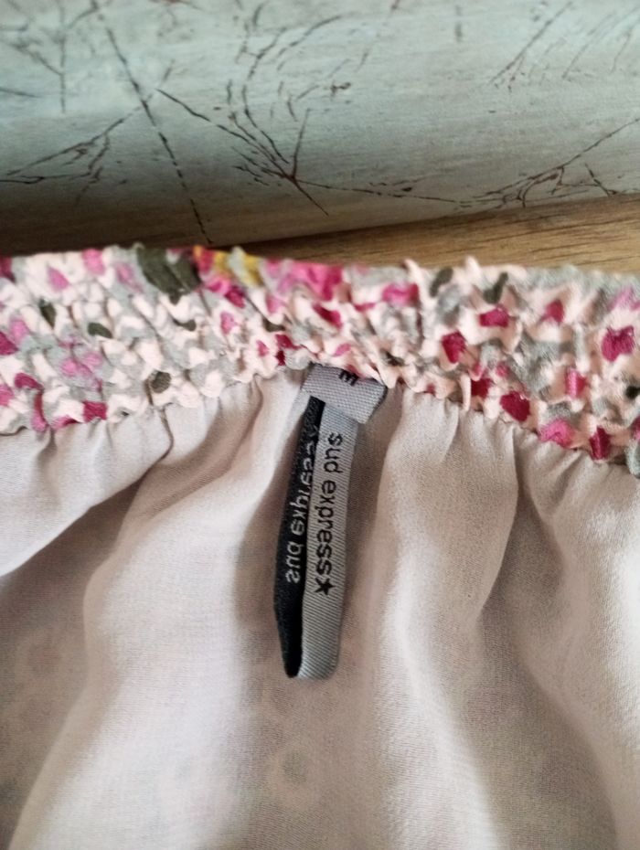 Marque SUD EXPRESS. En excellent état Couleur fleurie. Doublure en excellent état. Finition bas de jupe volants Longueur 40 cm