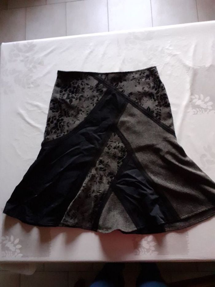 Jupe noir et grise de 62 cm de long et 41 cm a la taille. Fermeture éclair sur le côté Exclusivité seconde main.