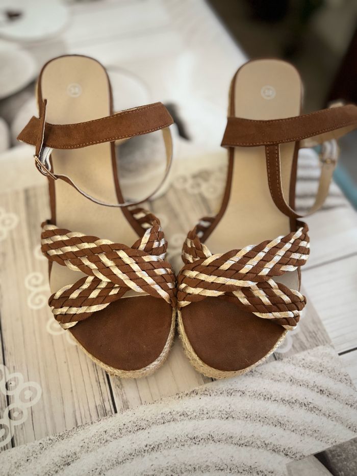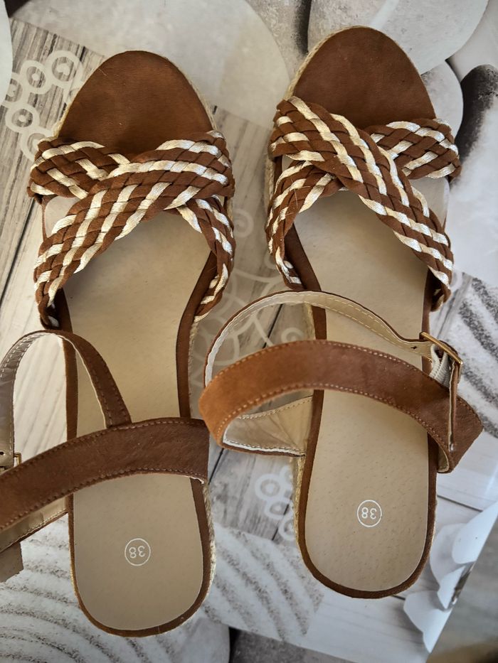 Superbe paire de sandales comme neuve, pointure 38 couleur Camel/Or Hauteur talon 9,5