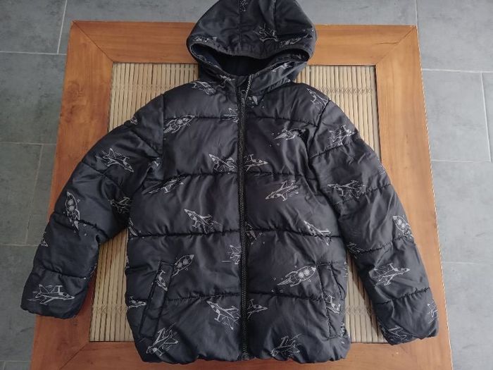 Doudoune avec capuche et poches, motifs des petits avions, intérieur polaire, un petit trou voir la 5ème photo, rien de méchant, une petite couture suffit.