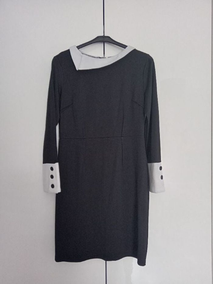 Jolie robe à manches longues noire et blanche, modèle fourreau, avec un col bateau, il manque un bouton à une manche, je fais donc un prix sur cette jolie robe