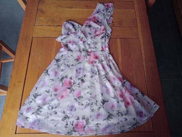 Magnifique robe printanière tons rose, fleurie, une épaule dénudée, se ferme avec une ferrmeture éclair sur le côté, robe doublée. Neuve, jamais portée. Elle est vraiment magnifique en vrai 💕