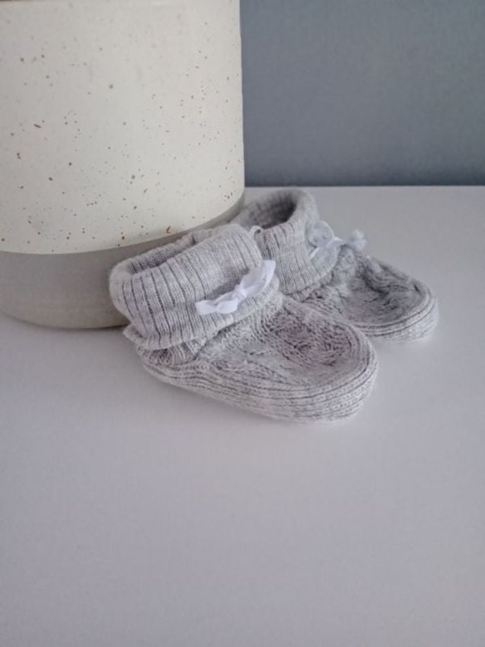 Jolie paire de chaussons de naissance gris pour un bébé en parfait état