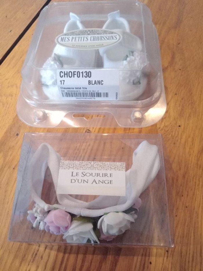Magnifique ensemble : - chaussons blanc à scratch taille 17 fleuris - bandeau assorti fleuri Marque Sourire d'un ange Neuf