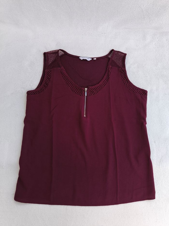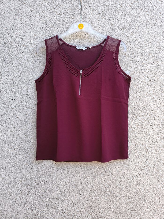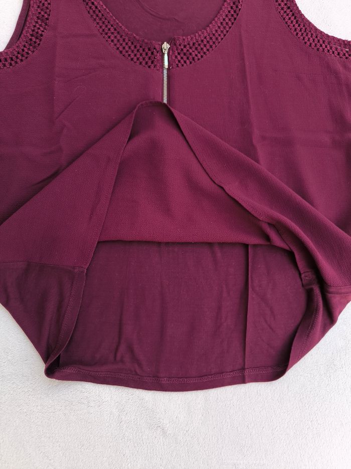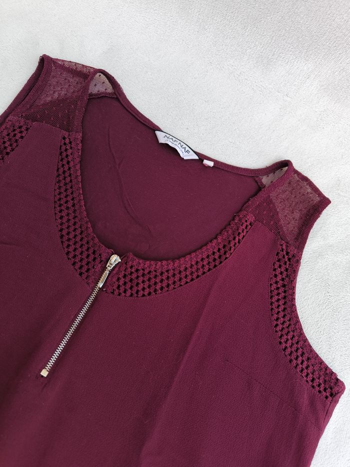 Débardeur à bretelles Marque Naf Naf Taille M, 38 • Coloris bordeaux, violet • Col rond, fermeture éclair • Dentelle/Broderie sur le haut • Bi-matière • Tissu fin, fluide Largeur aisselle à aisselle non étirée : 46 cm Largeur aisselle à aisselle étirée au maximum : 60 cm Longueur totale : 59 cm Longueur aisselle : 39 cm Peu porté, en très bon état #evelyne_taille_38