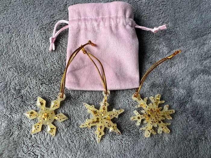 vends lot de flocons de noel en résine époxy de couleur jaune dore paillettes