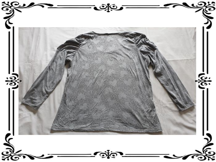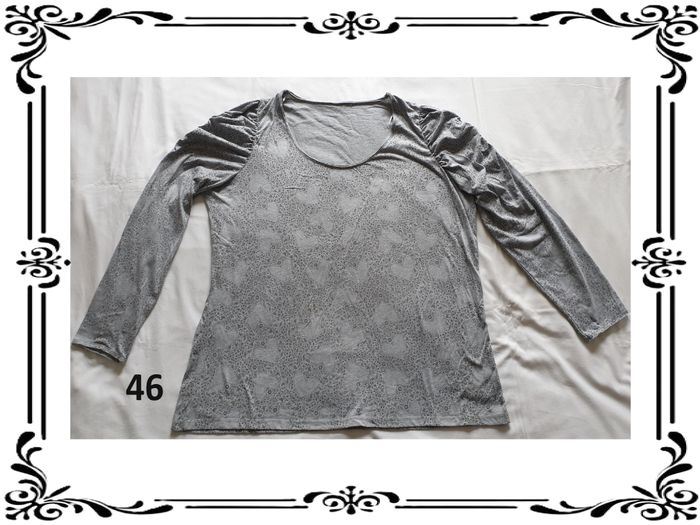 Tee shirt taille 46. Tee shirt manches longues gris clair à motifs gris foncé. Élastique sur le haut des manches. Tissu extensible sur 10 cm. Largeur d’épaule à épaule : 40 cm Largeur sous les bras : 63,5 cm Largeur à la taille : 60 cm Largeur en bas : 67 cm Hauteur de décolleté à partir des épaules : 18 cm Longueur totale : 74 cm Longueur des manches : 64 cm En très bon état. Sans marque. 3€. #vero38110vetementsfemme46