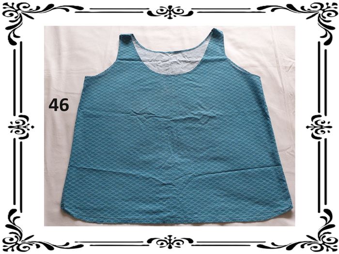 Débardeur taille 46. Débardeur bleu à motifs marine , blancs et verts. Tissu non extensible. Largeur sous les bras : 59 cm Largeur à la taille : 63 cm Largeur en bas : 66 cm Hauteur de décolleté à partir des épaules : 18,5 cm Longueur totale : 66 cm En très bon état. Sans marque. 3€. #vero38110vetementsfemme46